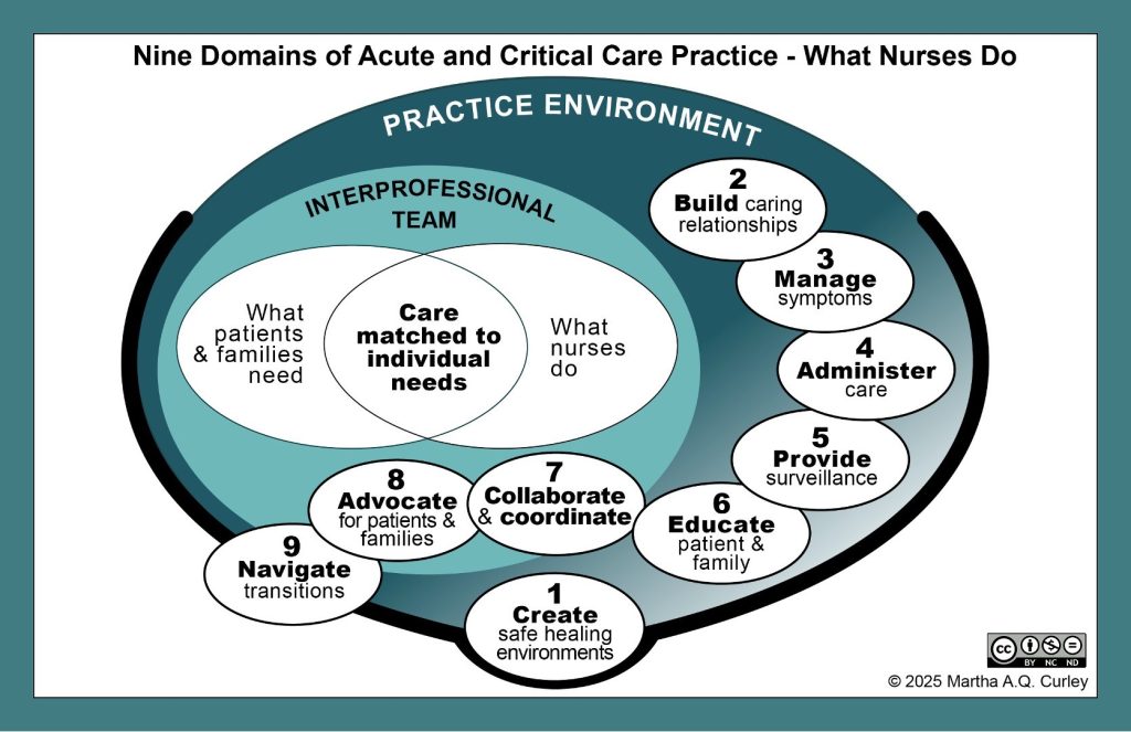 Build caring relationships with patients and families: This domain focuses on the intentional engagement of nurses in patient and family relationships that facilitate their health, recovery, and well-being. These relationships are rooted in nurse knowing patients and families as individuals, honoring their values, preferences, and inherent dignity. Caring relationships are enacted through the nurse’s presence, compassion, and empathy.